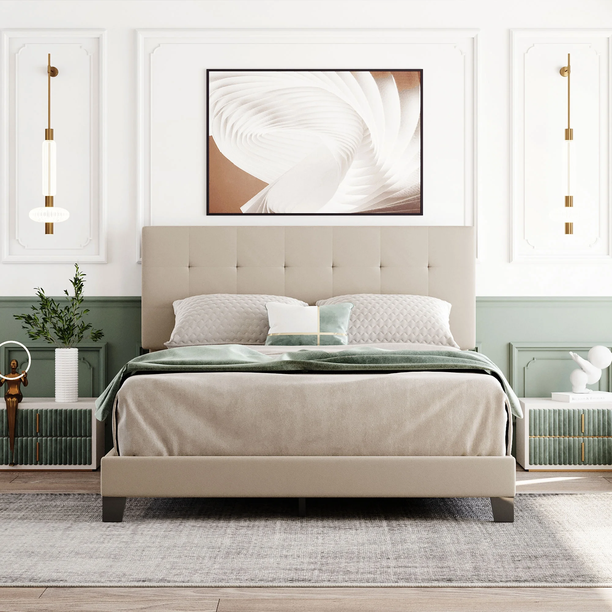 - Home Classic Bedroom Furniture Upholstered Platform Bed With Tufted Headboard Box Spring Needed Beige Linen Fabric Queen Size