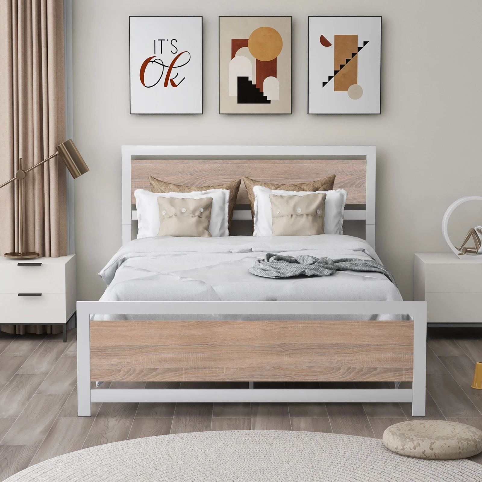 - Metal And Wood Bed Frame With Headboard Footboard Full Size Platform Bed No Box Spring Needed, Easy To Assemble White Black